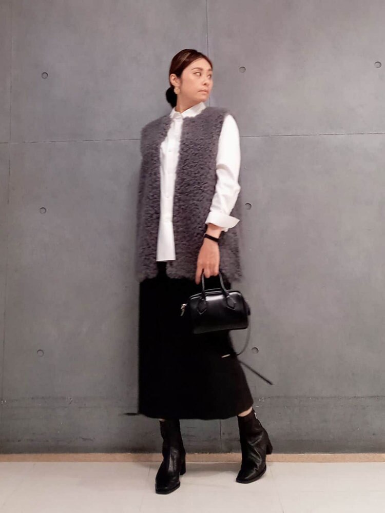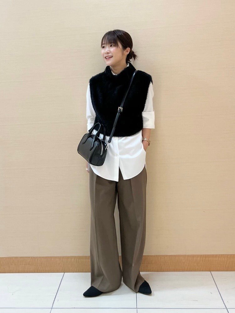 ベーシックなシャツに、ふんわりとした素材感のショートジレをレイヤードしたスタイリング。一点投入でお洒落に決まります。