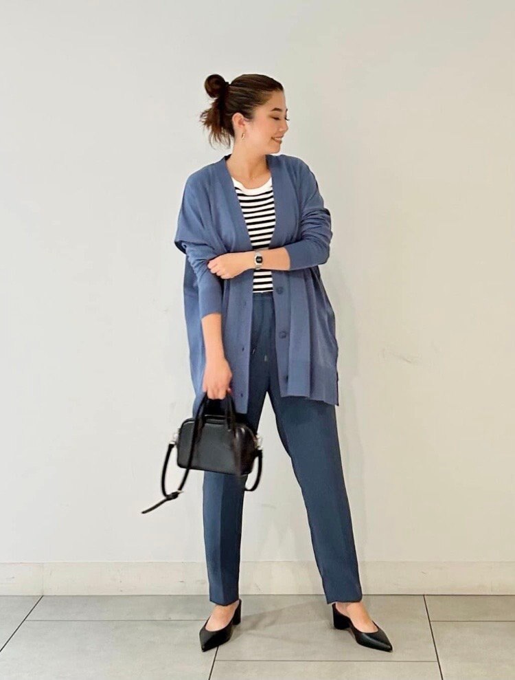 カーディガンとパンツをダルブルーでまとめたワントーンコーディネート。ゆったりとしたシルエットで着心地の良いカーディガンは、秋の羽織りにぴったりのアイテム。