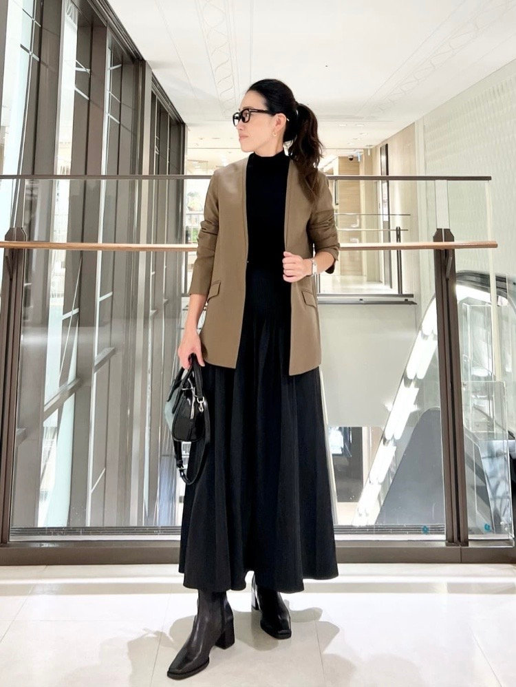 オールブラックコーデの差し色に、モカカラーのノーカラージャケットを。秋のムードがぐっと高まります。
