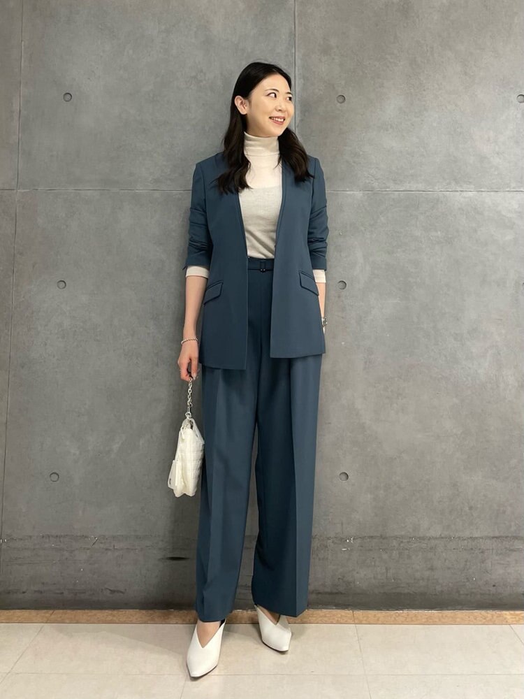 秋らしいダルブルーのジャケットとワイドストレートパンツをセットアップで。今年らしいシアートップスをインして、女性らしさをプラス。