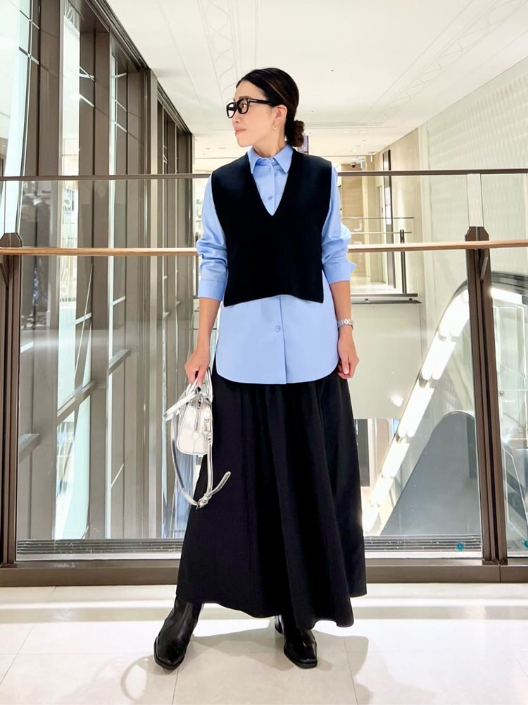 シャツにニットベストを重ねた、大人カジュアルなスタイリング。ベストは前後差のあるデザインで、程良くモードな印象に。