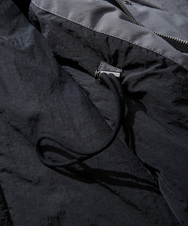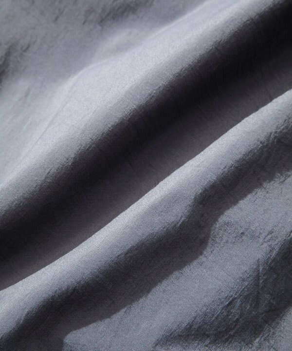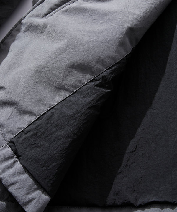 中綿アイテム専用の素材を、群馬県桐生市の機屋にて織りあげたタフタです。タテ糸にはポリエステル、ヨコ糸にはコットンを特殊な仕上げにより、ラフな表情ながら光沢感があり、コットンの優しい風合いが特長のATONオリジナル素材です。また、リサイクルカシミヤを使用した特殊な中綿を使用しています。