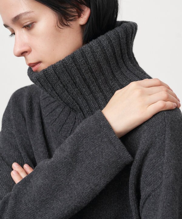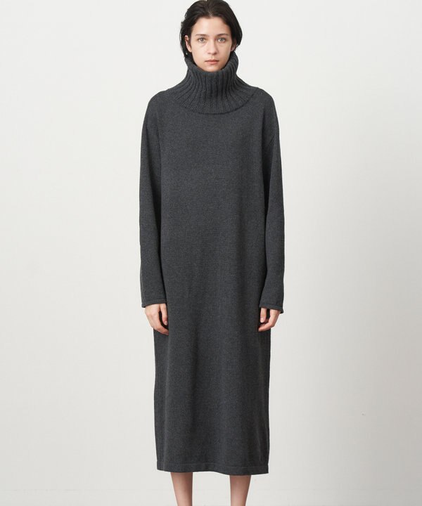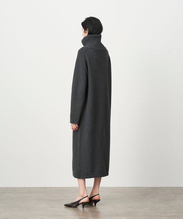 迫力ある衿が特徴のマキシ丈タートルネックドレス。身頃とは別の編み機で編んだむくっとした迫力ある衿をW付けにしているのでコートの中から出すだけでコーディネートのポイントになる1枚です。