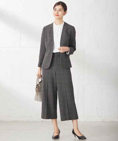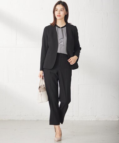 ノーカラージャケットとテーパードパンツでシュッとした印象に仕上がります。