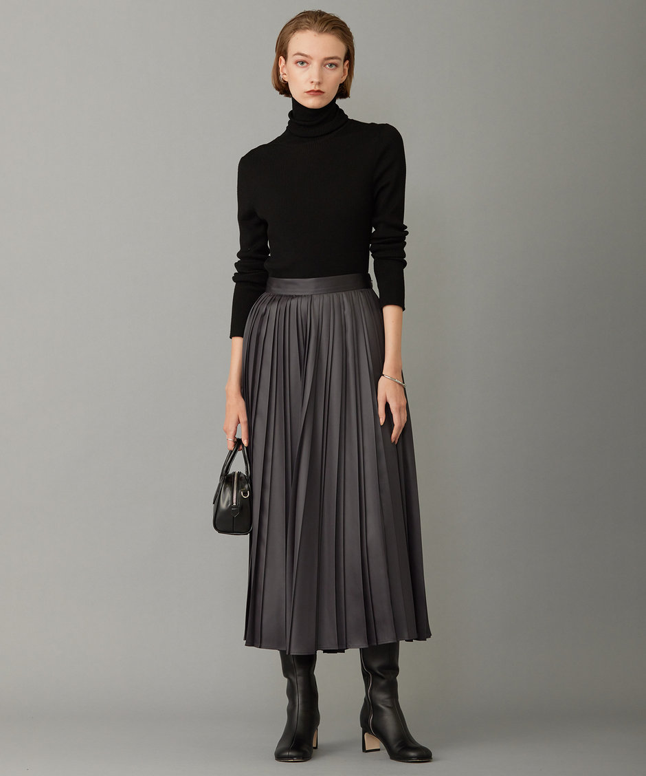 光沢素材のプリーツスカートで、秋のワンツーコーデをアップデート