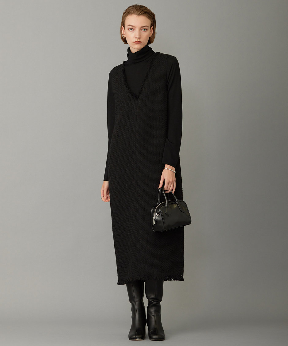 ツイード素材のジャンパースカートで、ワンランク上のレイヤードスタイルが完成