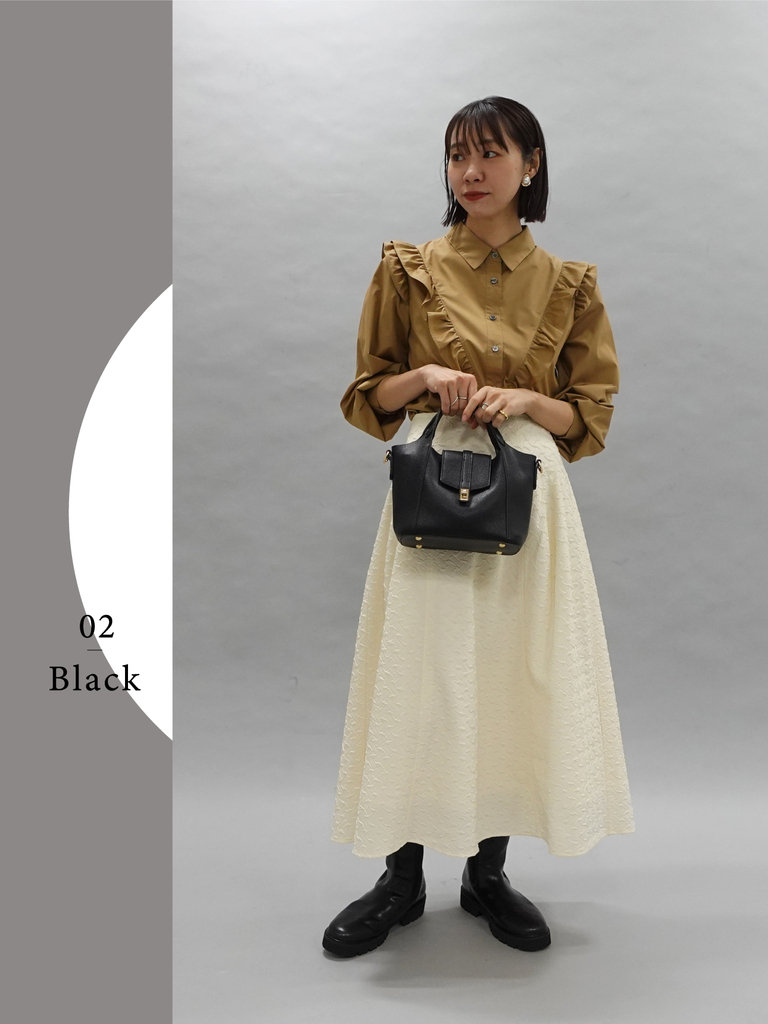 ちょっと甘めなスタイリングは小物をブラックで揃えれば