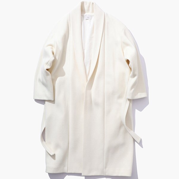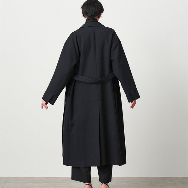 オーバーサイズシルエットのガウンコート。ストールのように立てても、倒しても美しい直線的な襟が特徴です。同素材のベルト付きです。