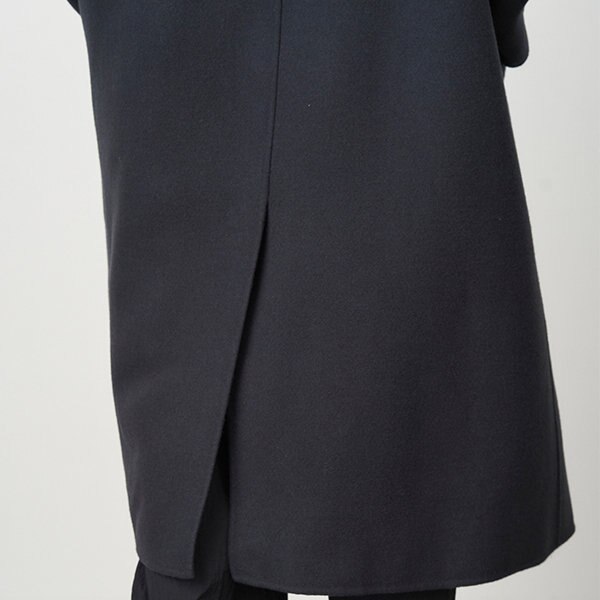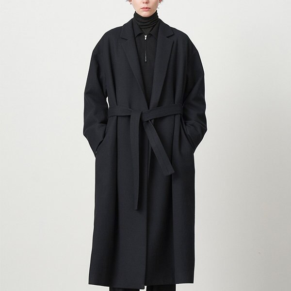 フルレングスのオーバーサイズコート。チェスターコートの襟のディティールのみを残したミニマルなデザインが特徴です。ガウンのようにラフに羽織って様になるデザインです。