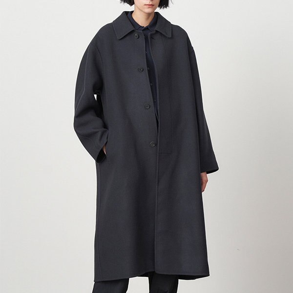 ゆったりしたシルエットがATONらしいバルマカーンコート。フロントデザインはセットインスリーブと比翼の前立てでシックに着こなせながら、バックは素材のハリを活かしてハギを減らしたドルマンスリーブになっているので、サイドからのコポッとしたシルエットが印象的なコートです。ユニセックスでは定番のアイテムですが、リバー素材で軽く上品に仕上げることで女性ならではのアイテムになっています。