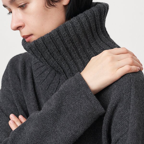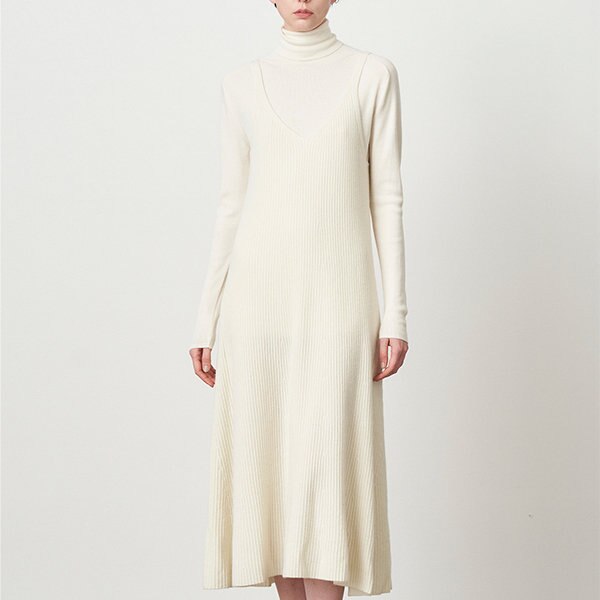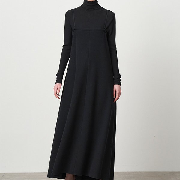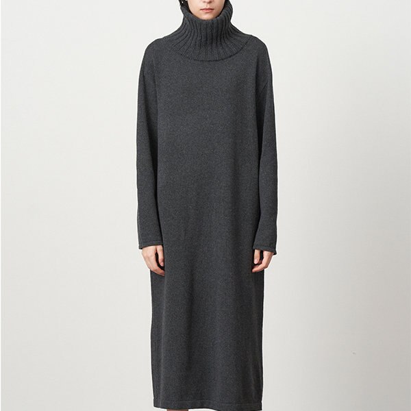 迫力ある衿が特徴のマキシ丈タートルネックドレス。身頃とは別の編み機で編んだむくっとした迫力ある衿をW付けにしているのでコートの中から出すだけでコーディネートのポイントになる1枚です。