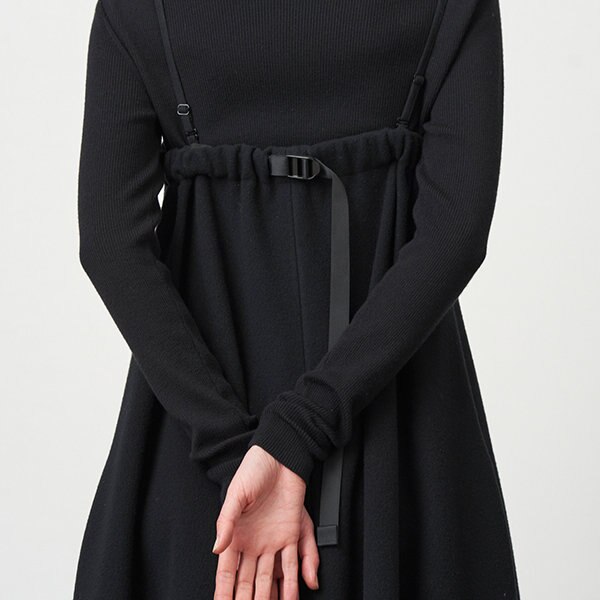 フルレングスのフレアドレス。立体裁断ならではの美しいドレッシーなシルエットと、後ろのバックルのスポーティな雰囲気のバランスがATONならではのアイテムです。肩ひも部分は取り外し可能で、長さも調節可能です。
