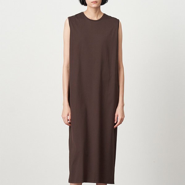 ノースリーブトップスをそのままストレートに伸ばしたマキシ丈のワンピースドレス。