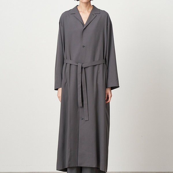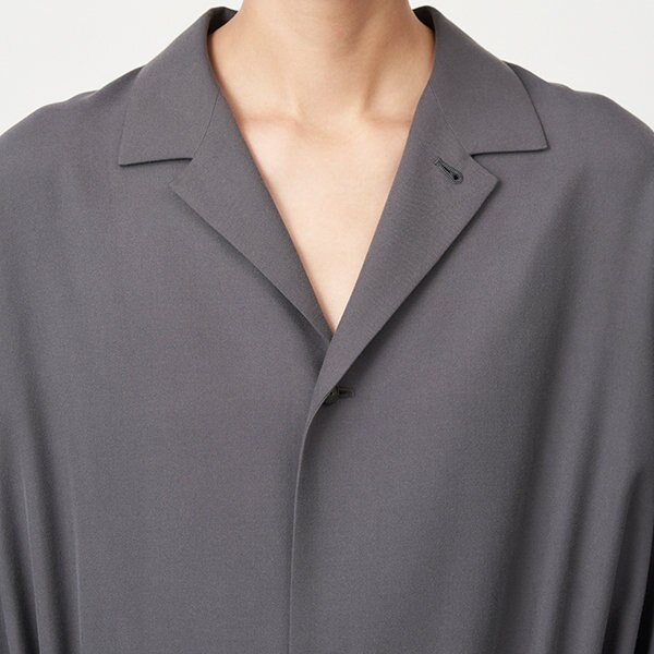 オーバーサイズシルエットのドレスコート。パジャマシャツを伸ばしたようなリラックスした雰囲気のデザインです。襟元は第一ボタンを留めてステンカラーコートのように着ることも、外して開襟衿のロングシャツとして着ることもできます。袖口や裾は共地の見返しを見えない位置でかがっているので、表側にステッチが出ないようデザインしています。