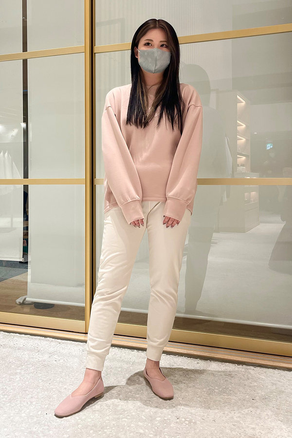 裏起毛パンツはスッキリとしたシルエットなので、トップはゆったりしたものを着用するとバランスが取れて普段のコーディネートにも取り入れやすいです♪