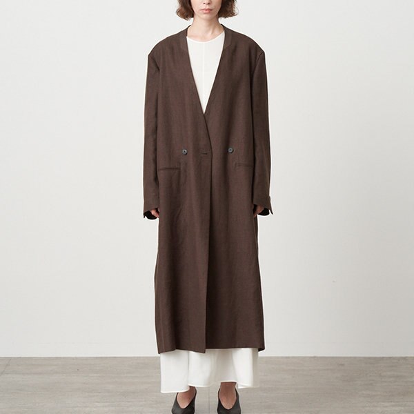 カラーレスのダブル釦のロングコート。襟の切り替えは、タキシードジャケットをイメージして同色のコットンのサテン生地を使用し、デザインアクセントにしています。。オーバーサイズシルエットに仕上げることで、着用時に出る落ち感のある表情が生地の良さを引き出しています。