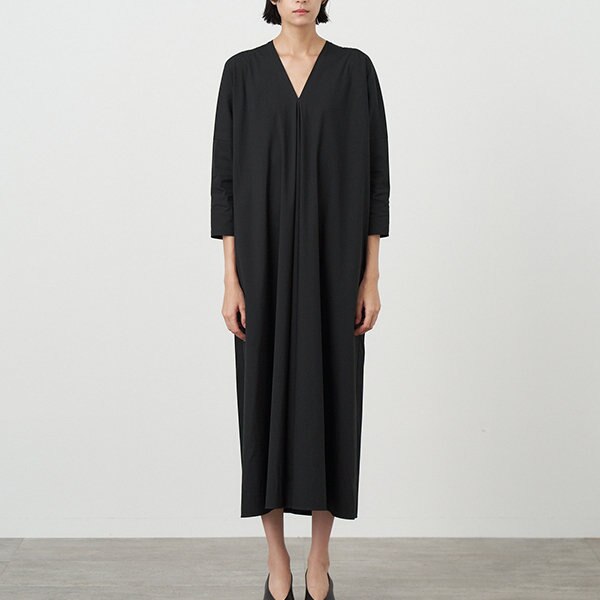四角い布に人の体を通すことで生まれた、素材そのものの持つ自然なドレープを最大限に活かしたデザインのVネックドレス。中心に集まったドレープが動くたび美しいロングドレスです。アームホールにボリュームが出るように袖付けを切り替え、袖口はたくし上げた時にキュッととまる寸法のドレスです。毎年人気のドレスですが、今季は素材に合わせて裾回りの分量感を減らし、アップデートしています。