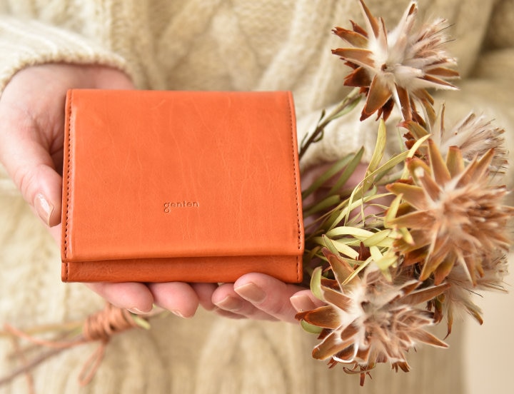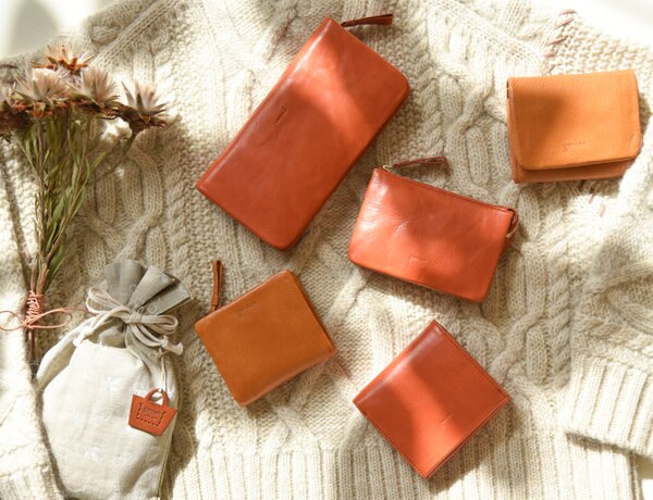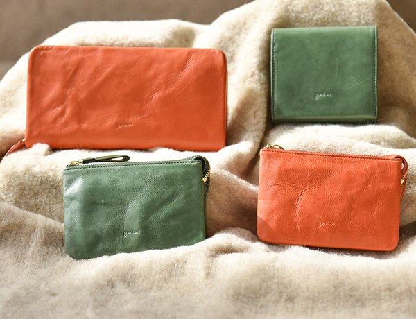 「マッティーナ」。左から時計まわりに長財布(レンガ)30,800円(税込)、二つ折り財布(ヒイラギ)26,400円(税込)、フラグメントケース(レンガ)22,000円(税込)、フラグメントケース(ヒイラギ)22,000円(税込)