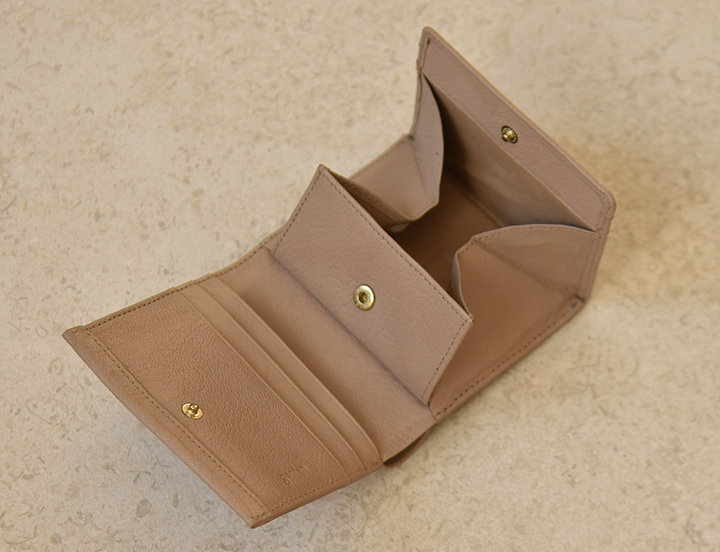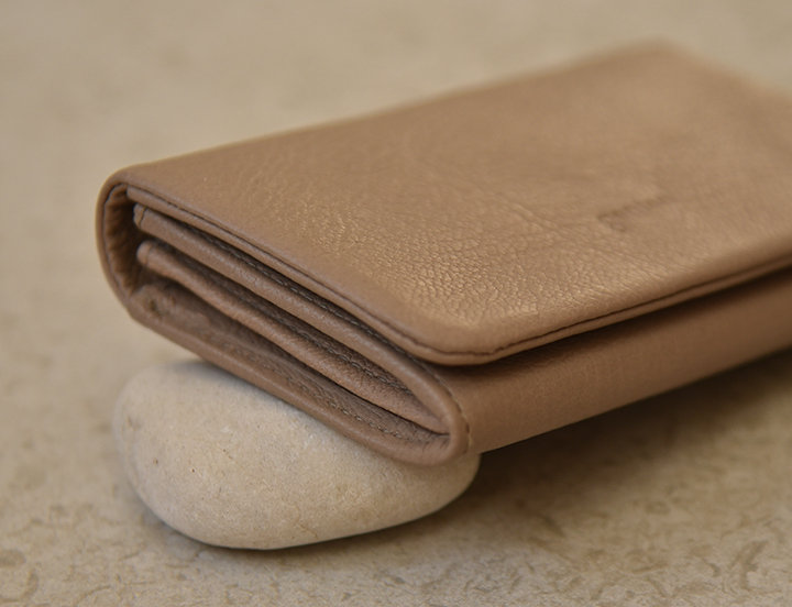 「ゴートベーシック」。左から二つ折りBOX(グレージュ)22,000円(税込)、名刺入れ(グレージュ)13,200円(税込)、パスケース(グレージュ)9,900円(税込)
