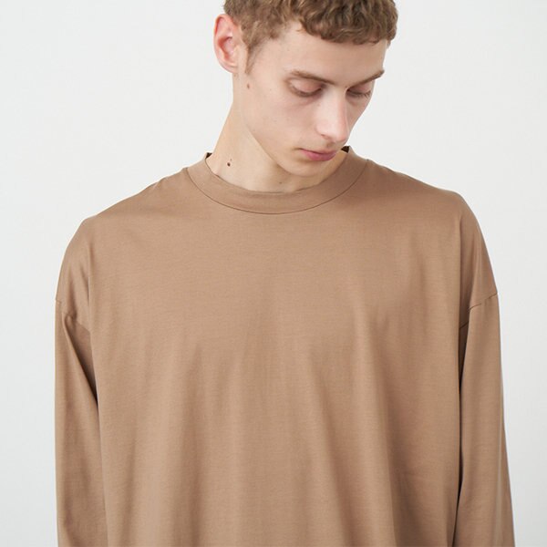 オーバーサイズが特徴のATON定番ロングスリーブTシャツ。ゆとりのあるシルエット、横幅に対し縦の比率が少し長く、モードな印象です。男性向けですが、素材に落ち感があり、女性がオーバーサイズで着用できる1着です。