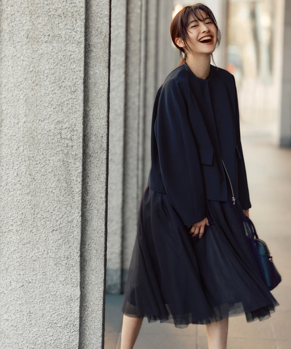 ただ着るだけで華やぐのはもちろんのこと、ネイビーのアウターを合わせて統一感を出せば、母行事にも対応できる守備範囲の広さはお守り的存在。