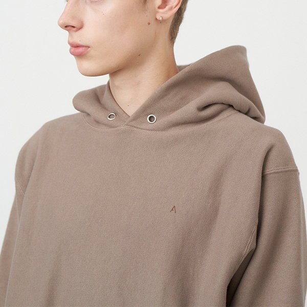 シャープな三角形のフードと、少し大きめのシルエットが特徴的なATON定番のフーディースウェット。袖口は力点を一点に集中させない様、リブをトライアングルに設計しており、機能を兼ね備えたデザインになっています。胸元に付いた、"A"マークは植毛フロッキーの為、剥がれること無くベルベットの様な手触りです。