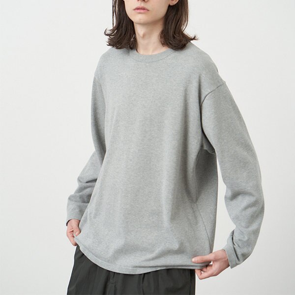 程よいリラックス感が特徴のクルーネックセーター。14ゲージを採用し、度詰めでしっかりとした肉感と着心地に仕上げました。裾は縮まないように、Tシャツのような仕様を採用しています。洗濯機での洗濯でもダレにくく、着心地と取り扱い共に、Tシャツのような感覚で着用いただけます。