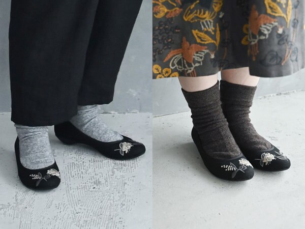 履き心地にこだわった編み方の考案を重ね、カシミヤとウールの柔らかさを最大限に引き出すと共に、ナイロン混紡にすることで靴下の強度を増しました。手編みならではの、特別な靴下になっております。特に、つま先と踵の部分は足のフォルムに沿って、立体的で踵の形に丸みを持たせたデザインにすることで、足の形にフィットさせて動いてもズレにくいように考慮しました。履き口も『袋編み』という技法を使うことで、締め付け感がありません。足首に少しクシュっと溜めたスタイリングもお勧めです。