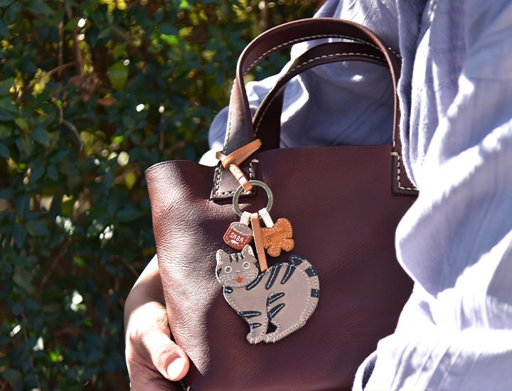 チャームは小さなものですが、そのつくりは手抜かりなし。丸みを帯びて今にも動き出しそうなボディと表情豊かな顔。細かなところまで小さな革を重ねてステッチを施し、目はカシメという金具で仕立てました。手しごとを大切にする職人技が光ります。