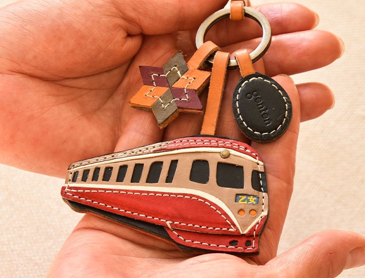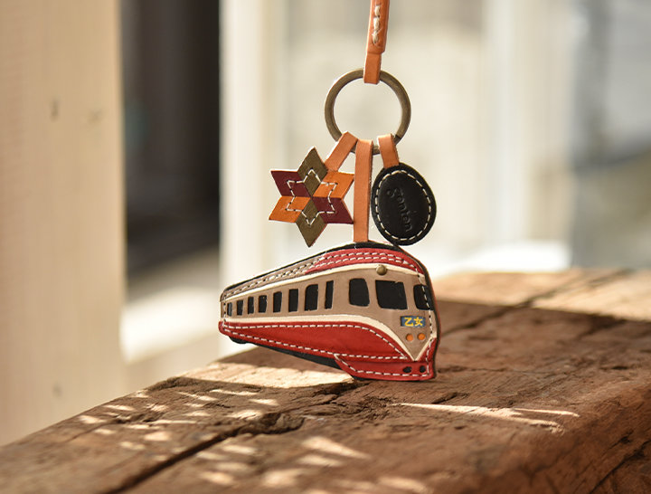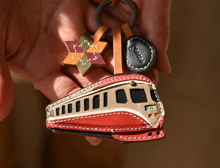 左側のサブアイテムは、箱根の伝統工芸品である寄木細工を革で表現した“寄革細工”。そして右側は、1個食べると寿命が7年延びるといわれる大涌谷の名物、黒たまご。ロマンスカーで旅した箱根の思い出をお供にしたようなアイテムです。