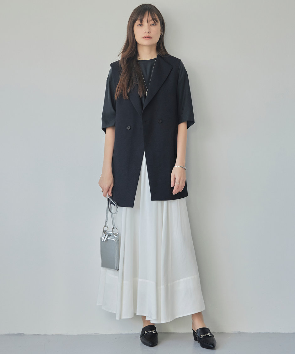 ハンサムなジレスタイルに、分量感のあるフレアスカートで軽やかさをプラス