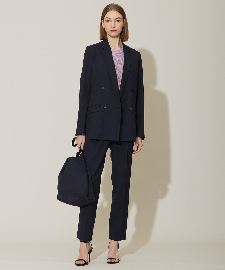 グレープカラーの差し色使いで、定番ジャケットセットアップが春らしい印象に