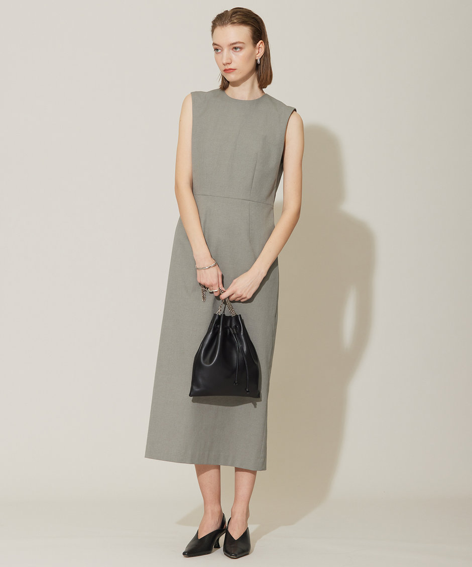 上品でこなれた雰囲気を演出する、モスグレーのノースリーブワンピース