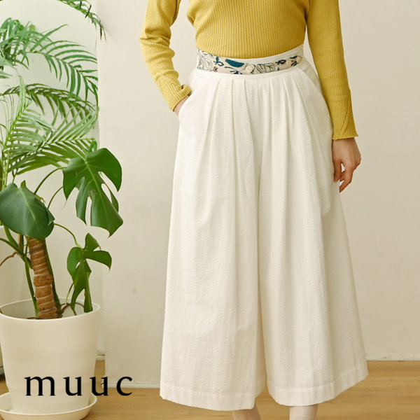 こちらのパンツはロング丈で生地をたっぷりつかったフレアーシルエットです。カジュアルなシーンでも動きやすく、楽でゆったりとした履き心地でありながらエレガンスな装いを演出してくれます。前身頃の刺繍入りベルトも特長なので、トップスの裾を入れてウエストベルトを見せるスタイリングもお勧めです。後ろ身頃のみウエストゴム仕様で、内側紐でも調節可能ですので、着脱しやすく様々な体型の方に着ていただけます。また、ホワイトカラーのみ透け防止に裏地が入っています。