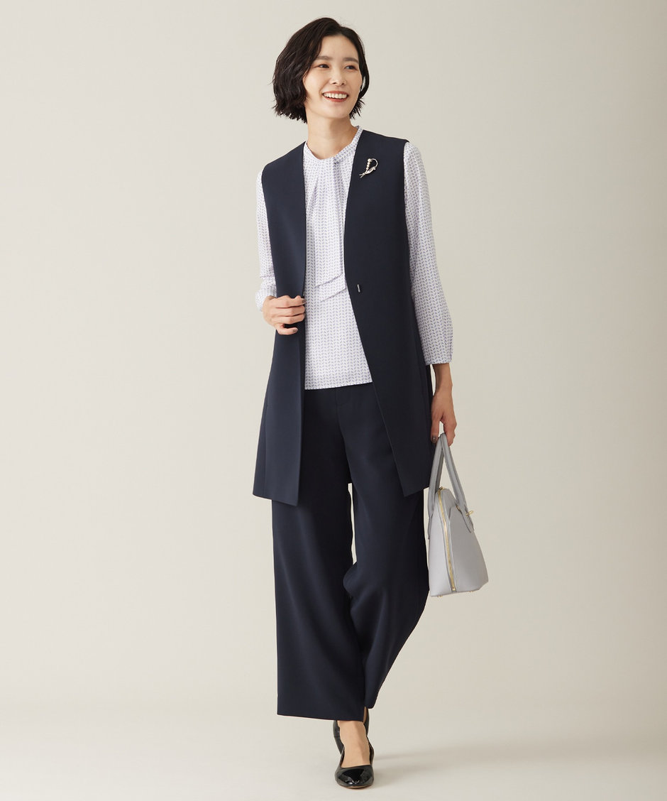 上品な雰囲気に仕上げた、トレンド感のあるジレ。すっきりとしたIラインシルエットに、シャープな印象のVネックで着回しやすく、気温に合わせてインナーのトップスを変えることでロングシーズン活躍。実用的なポケット付きで、両サイドにスリットを入れて動きやすく仕上げました。オンオフ使えてオケージョンスタイルにも着用できる仕立ての良い1枚です。
