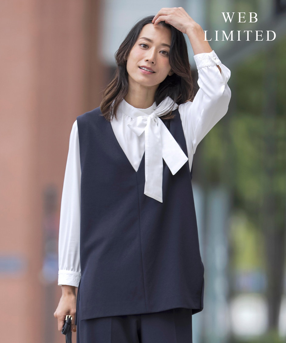 顔まわりをすっきりとした印象に見せる、Vネックのベスト。前ぶりのサイドスリットが軽やかな印象で、きれいめのスタイルにも合わせやすいデザインです。伸縮性ときちんと見えを両立した、長時間着ていてもノンストレスなジャージー素材です。さらりと肌を離れるきれいなドレープ感が心地よく、しわになりにくくご家庭で洗濯できるイージーケア性がポイント。