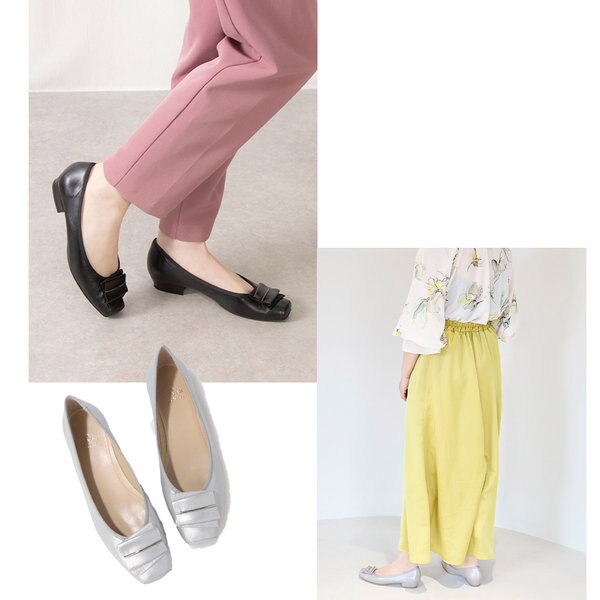 程よくシャープなスクエアトゥでフラットでも上品見えしON/OFFどちらも活躍する一足です。