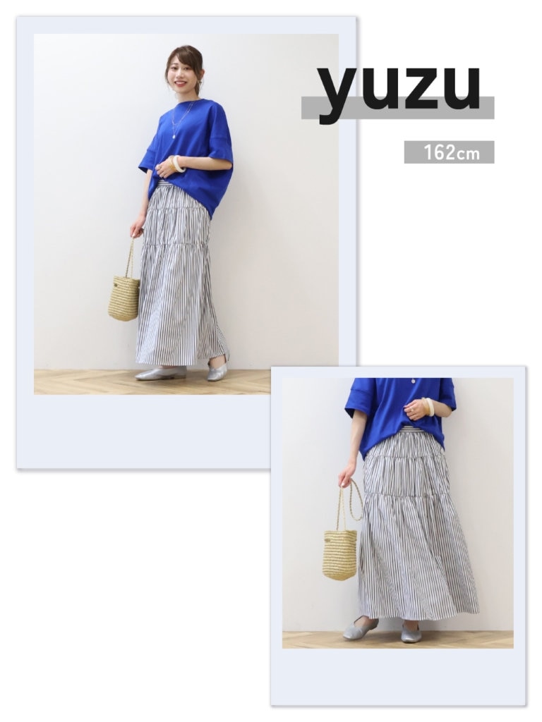 鮮やかなブルーのトップスには、落ち着いたカラーのストライプスカートがおすすめ!