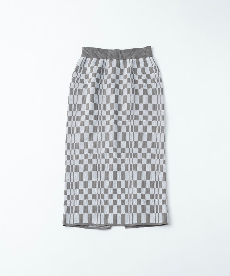サイズの異なるブロックがランダムに並んだユニークな市松模様のニットスカート。