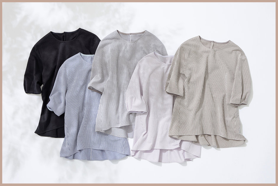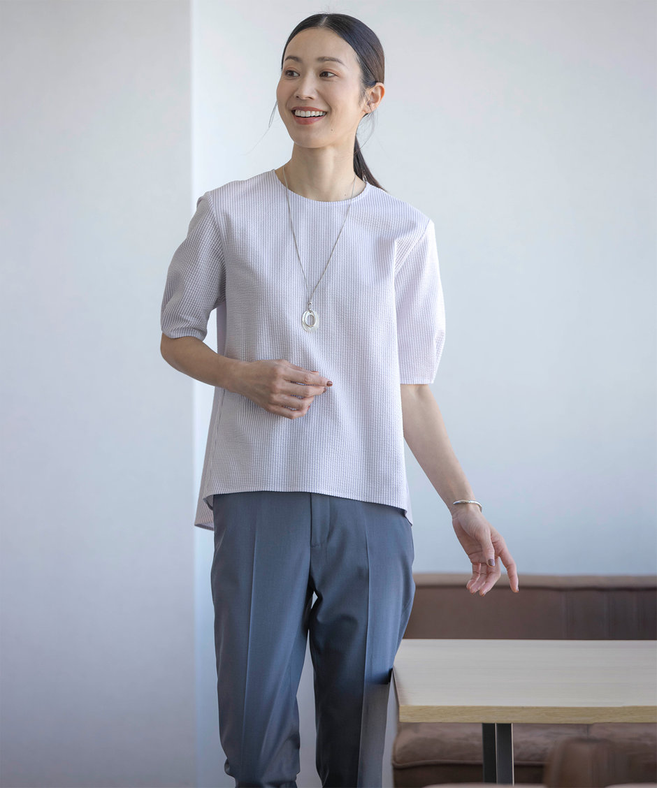 5分袖で、ボリュームの出過ぎないタックスリーブのカットソー。後ろをほのかなペプラムにして、女性らしいシルエットにしています。後ろはスナップ開きのため着脱もしやすいです。さらりとした着心地で夏も快適に、ロングシーズン活躍します。