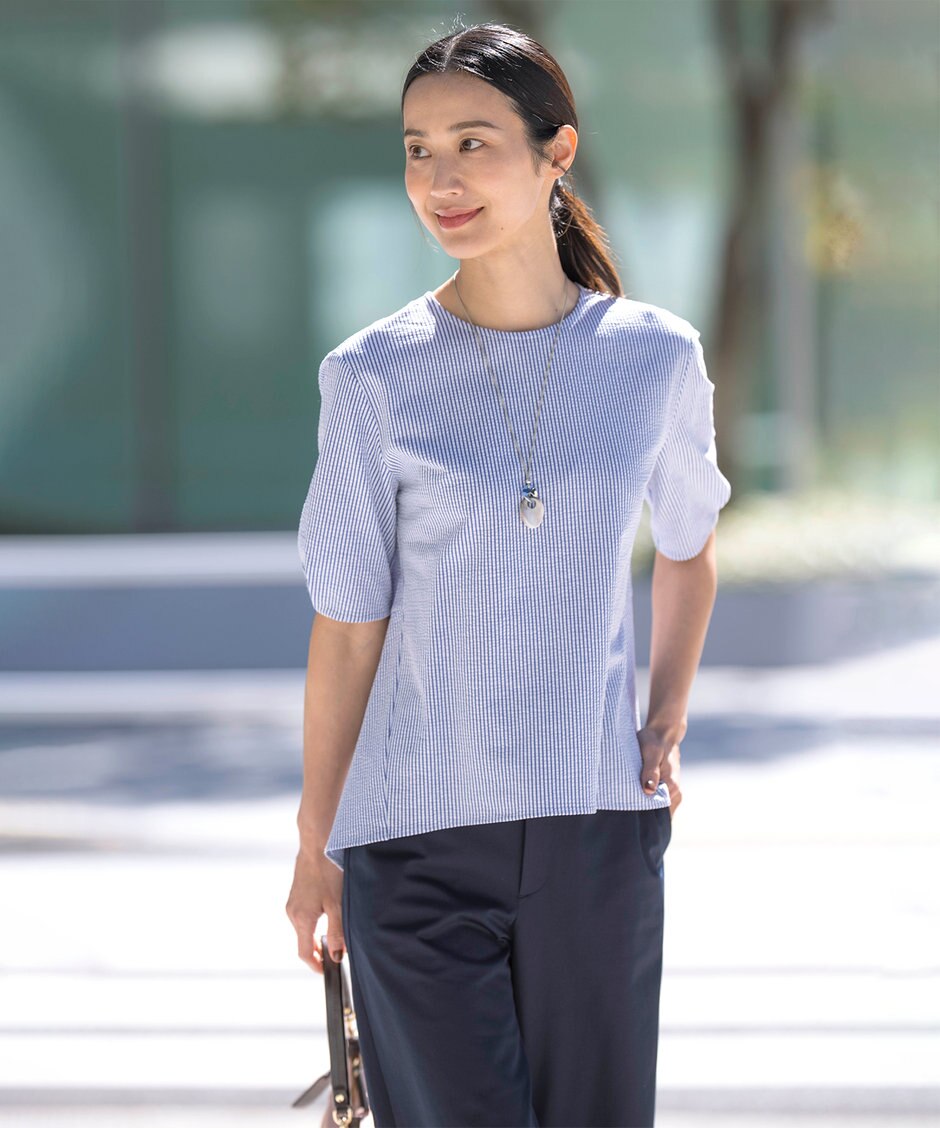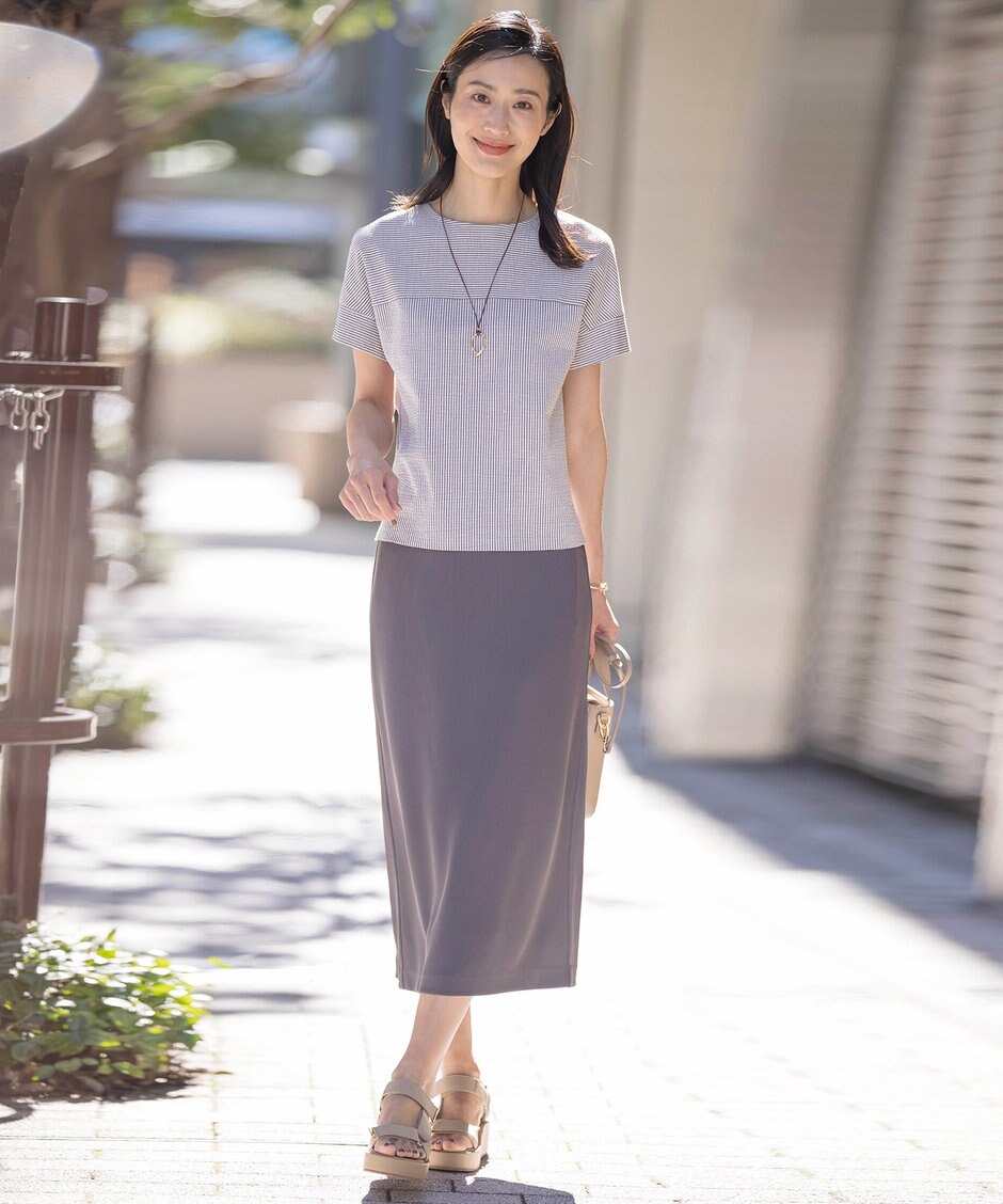 ストライプ生地を前ヨークにはボーダー使い、身頃はストライプ仕様にしてポイントにしたカットソー。二の腕が隠れる長めの裄丈のフレンチスリーブが、涼しげな雰囲気を演出します。裾の脇にスリットを入れた、ボディラインを拾わないシルエットが魅力です。