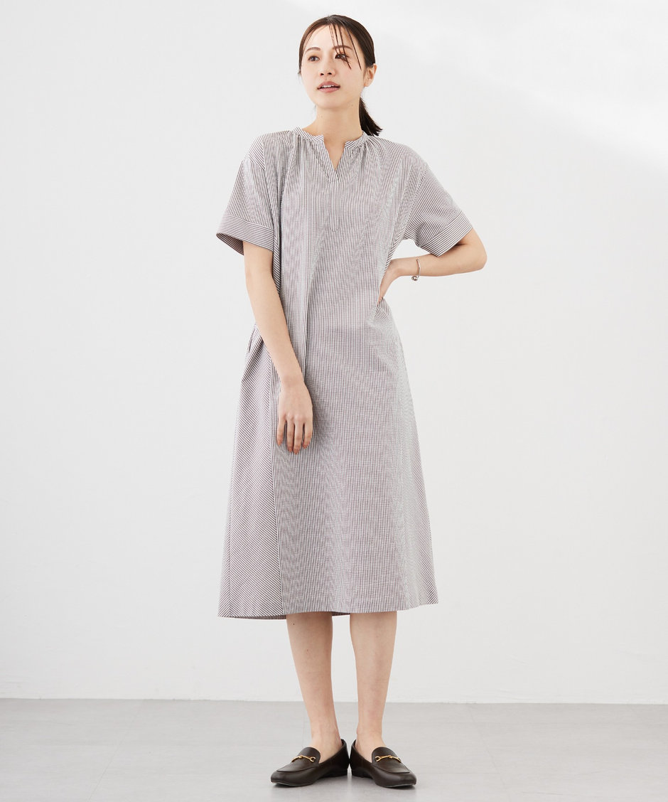 バンドカラーにギャザーを入れて、優しい雰囲気に仕上げたワンピース。すっきりとしたAラインシルエットで、暑い日でも快適に着用いただけます。さりげないスラッシュポケット付きで、機能面も充実◎。着用するだけでサマになる、コーディネートいらずのアイテムです。