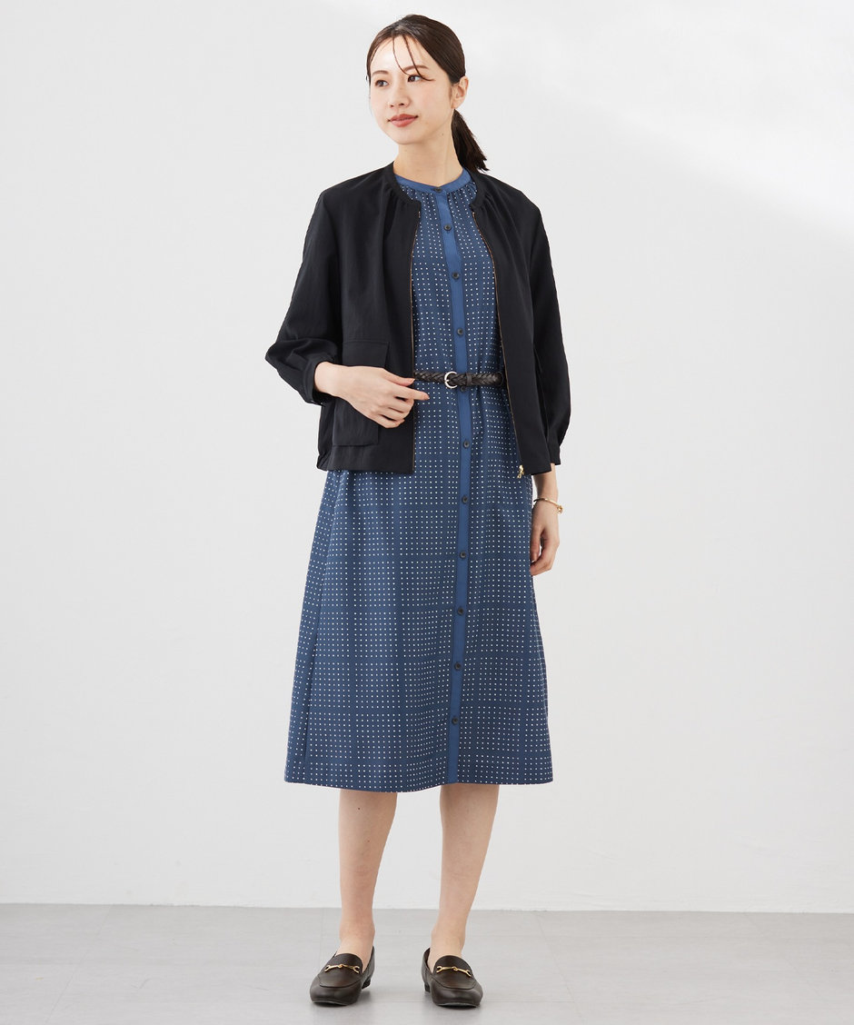 前の襟ぐり部分にギャザーを入れた、女性らしい雰囲気のワンピース。襟と前立て部分に別布を使用し、配色感を出してアクセントに。シンプルなクルーネックと、ストンと落ちるようなAラインシルエットがポイント。肘が隠れるくらいの6分袖で気になる二の腕をカバーでき、冷房対策にも活躍します。大人な印象のドット柄は、1枚でもインナー使いでも、さりげない華やかさを演出してくれます。