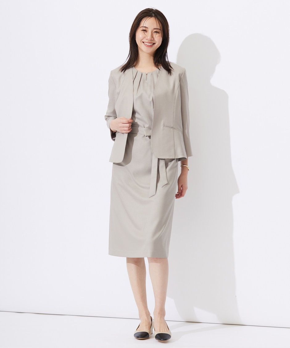 Aラインのシルエットできれいめ上品なワンピース。前にビジューの飾りをつけて、華やかな雰囲気に仕上げました。6分袖で、袖口にタックディティールを取り入れていますがボリューム感を抑えているため、ジャケットと合わせても着やすい仕様に。共布リボンがついており、ウエストマークで雰囲気を変えていただけます。UV加工、吸水速乾、ウォッシャブル機能もあり、夏のビジネスシーンにもおすすめです。