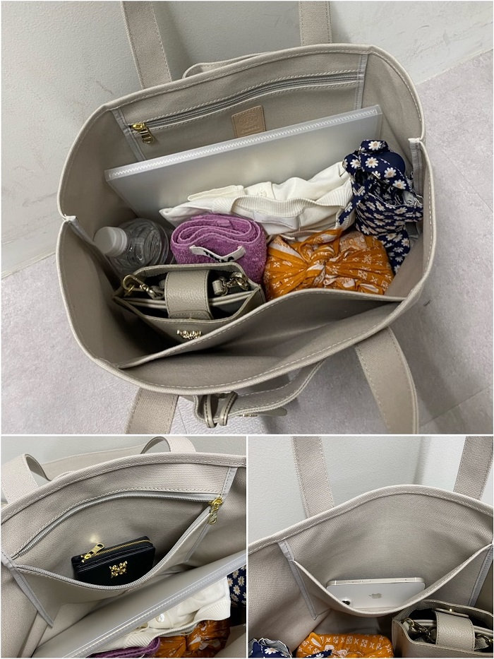 ポケット付きではありますが、大きめで荷物が泳ぐのが心配な方はミニショルダーとの2つ持ちもおすすめ◎