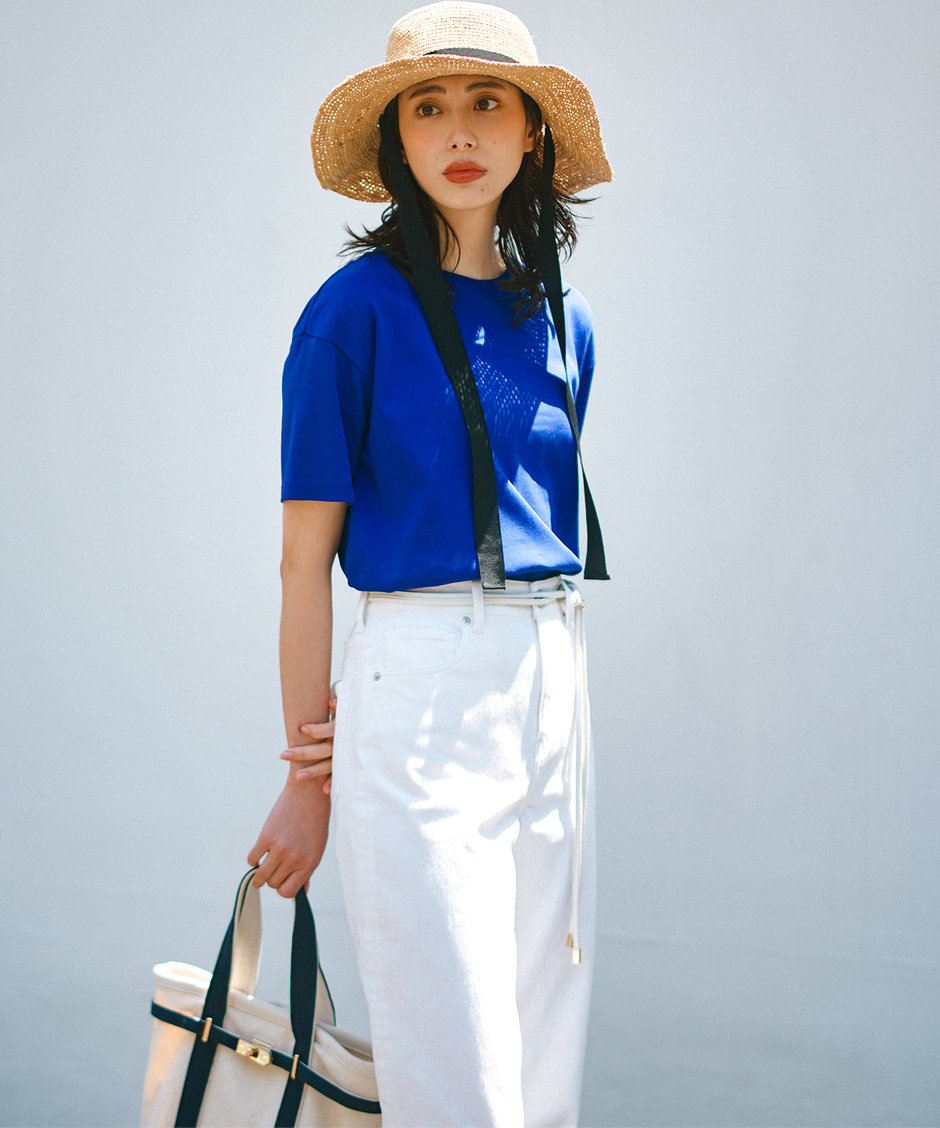 ホワイトのパンツとラフィア素材のハットが夏っぽさをより引き立てます。