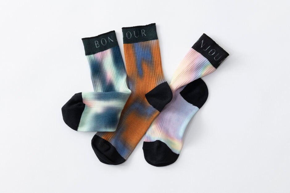 BONJOURのメッセージと共にデザインされたAURORA柄のプリントソックス。