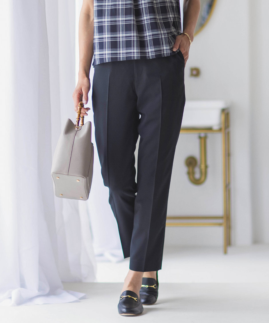 脚のラインをキレイに見せるように拘ったテーパードパンツ。ヒップまわりもすっきりしており、センタープレス入りのため脚長効果も期待できます。後ろウエスト部分にゴムを入れて伸縮性をもたせた、ストレスのない穿き心地です。シワになりにくく、家庭洗濯が可能なイージーケア素材◎。