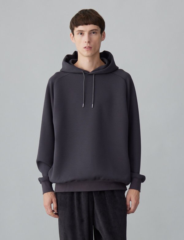 リラックスムード漂うボディ感がボディラインを拾わないので、品よく見せてくれるパーカーは、大き目なフードが印象的。