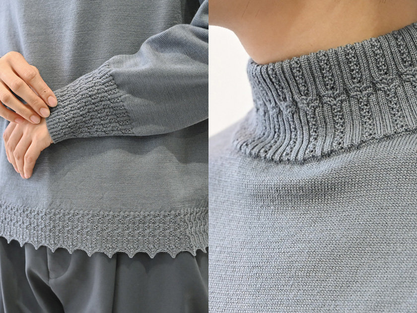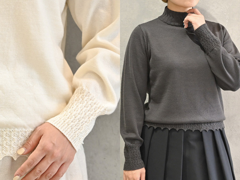 こちらのニットは、イタリア・ビエラスタイルのレシピに基づき作られたエキストラファインメリノを使用しています。空気を含みふっくらとしつつもつるっとした表面感が特徴の糸で、ほど良く光沢と優しい肌触りです。衿・袖・裾をレース模様編みにしています。